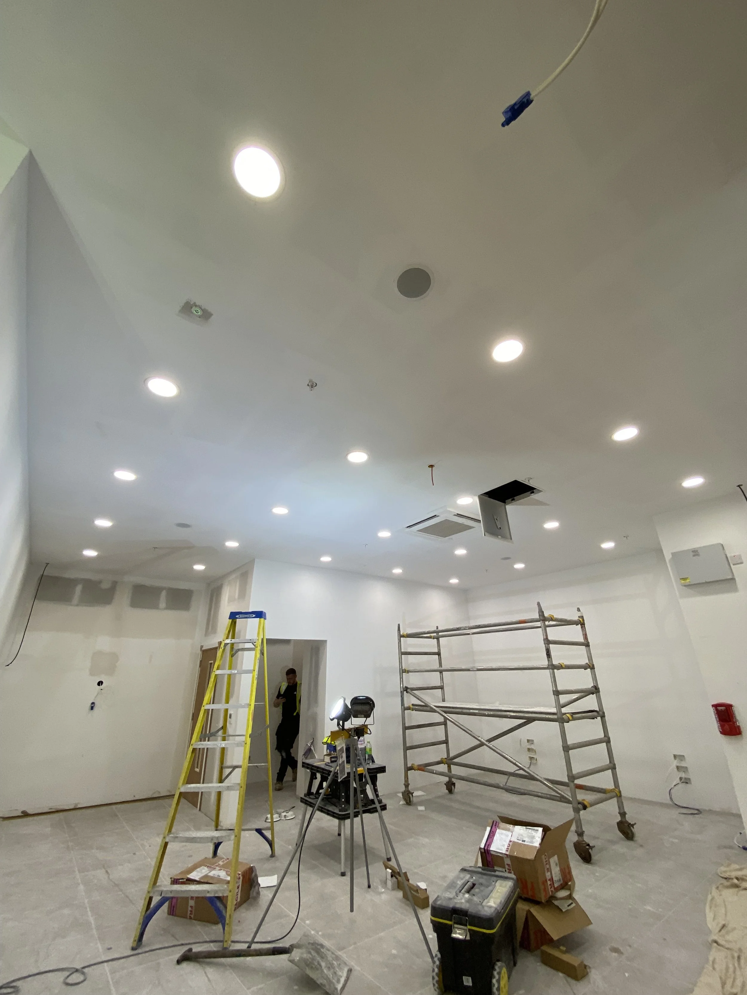 Commercial electrical install involving setting up wiring, lighting, and power systems in buildings used for business or industrial purposes